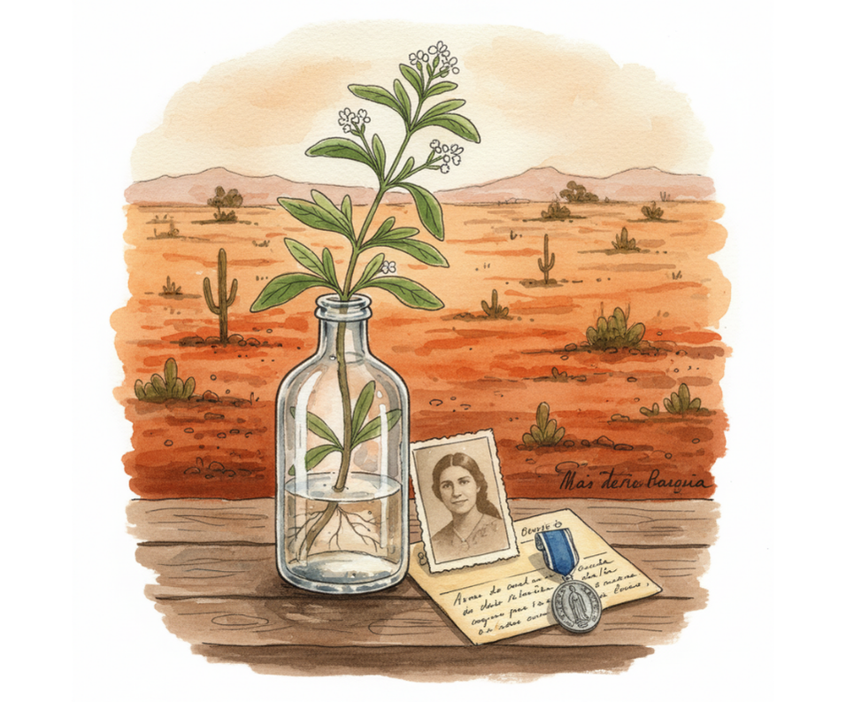 Y un día pasó lo que le preocupaba tanto a Delfina: su ahijado fue herido cuando una bala boliviana le penetró su brazo. El dolor era terrible y temía que se iba a quedar como el pobre soldado viejo de la guerra grande, sin su brazo. Pobre Inocencio, gritó que si alguien podría, por favor, alcanzarle lo único que él podía tomar para que le aplacara el dolor, la caña de su padre. Lo que Inocencio no podía saber en ese momento es que las propiedades medicinales del ka’a he’ẽ eran las que ese día en Boquerón le salvaron la vida.